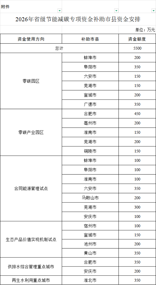 重點支持零碳園區(qū)、合同能源管理!安徽2026年省級節(jié)能減碳專項資金補助市縣資金安排公示