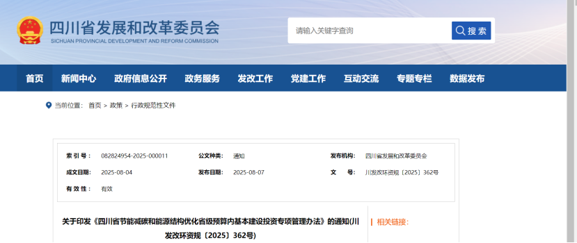 8月7日,四川省發(fā)展和改革委員會發(fā)布關于印發(fā)《四川省節(jié)能減碳和能源結(jié)構優(yōu)化省級預算內(nèi)基本建設投資專項管理辦法》的通知(川發(fā)改環(huán)資規(guī)〔2025〕362號)。