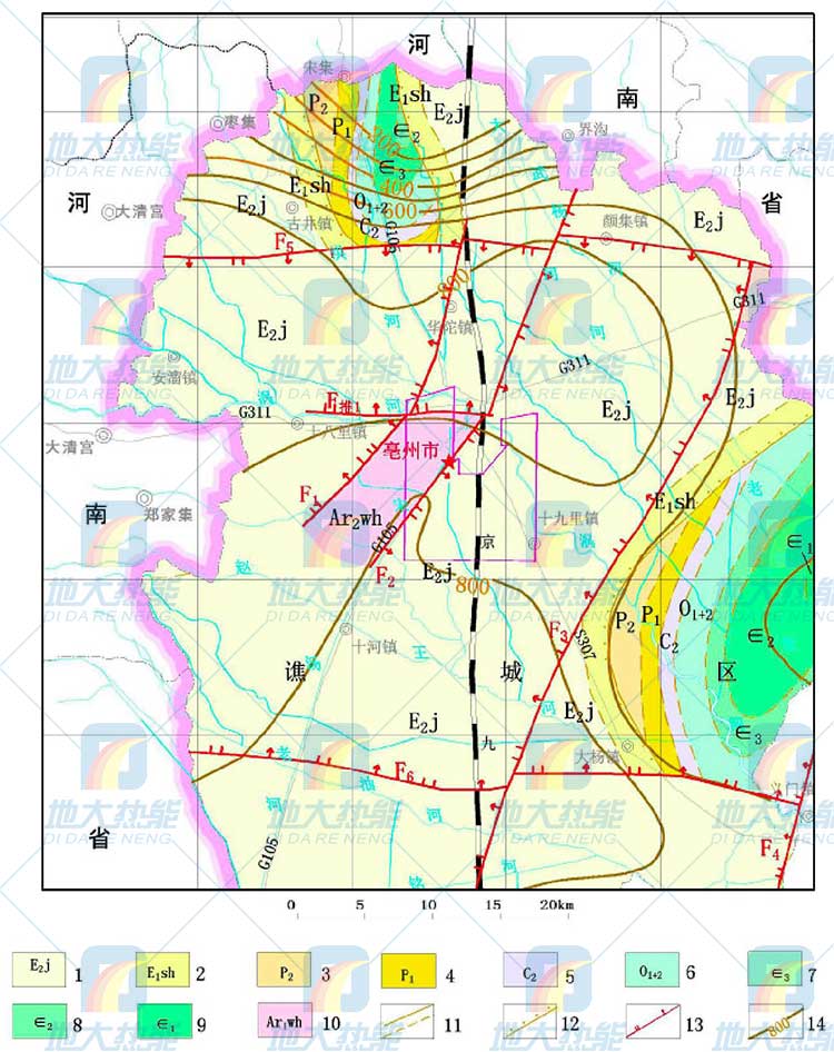亳州市地層屬于華北地層區(qū)淮河地層分區(qū)淮北地層小區(qū)。區(qū)域地層主要發(fā)育有太古界五河群、下古生界寒武、奧陶、上古生界石炭、二疊系、新生界新近系、古近系和第四系,地表皆為第四系覆蓋。對地?zé)?/a>與供水意義較大的地層如下: