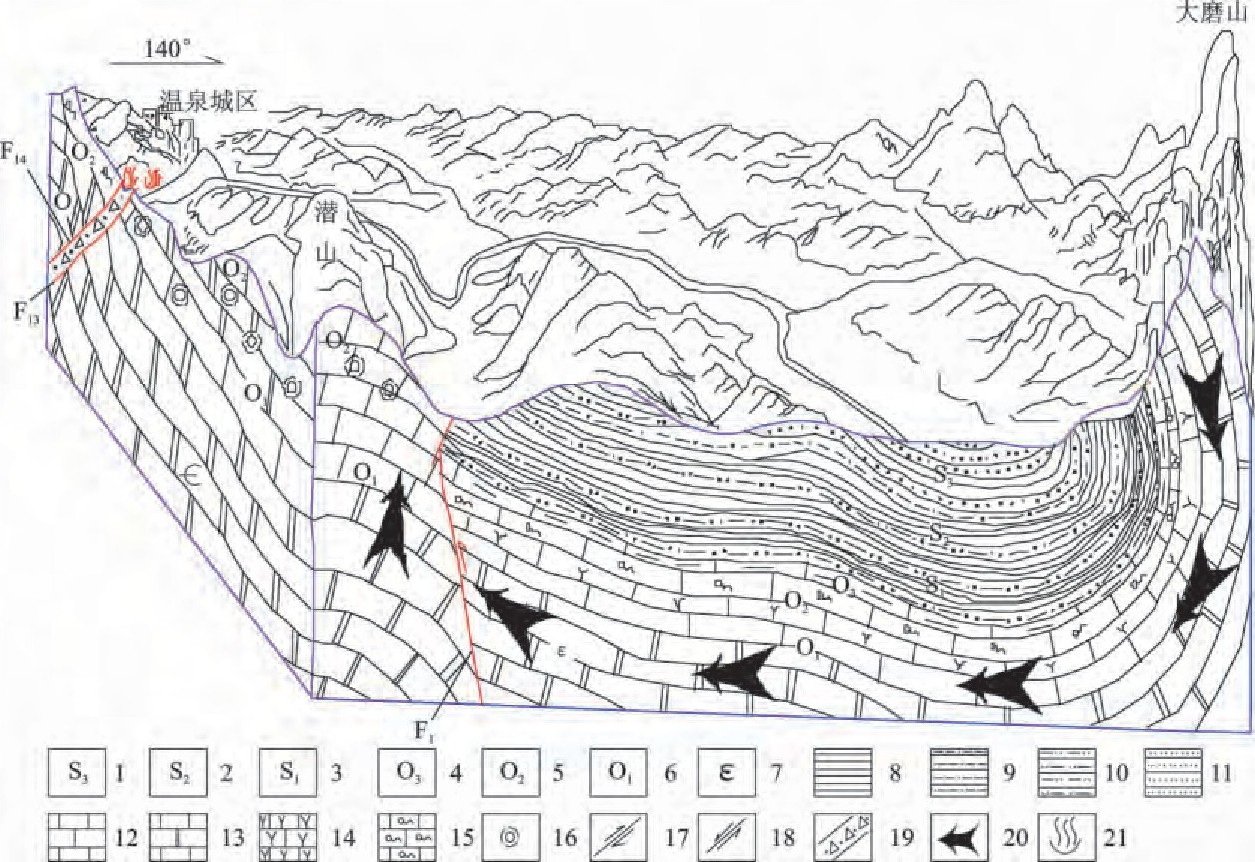 咸寧地質(zhì)構(gòu)造位置處于揚子準地臺梁子湖坳陷與咸寧臺褶束的交接部位,從屬于大幕山復式背斜北翼的次級構(gòu)造—高橋向斜、孫鑒鋪倒轉(zhuǎn)背斜、賈家山倒轉(zhuǎn)向斜的西延部分,由一系列的緊密褶皺組成區(qū)內(nèi)的基本構(gòu)造骨架。新華夏晚期構(gòu)造體系在潛山一帶表現(xiàn)強烈,其中大義山式斷裂有明顯的反映。這些不同的構(gòu)造體系互相干擾、復合,不僅控制了區(qū)內(nèi)的巖性組合、地貌、巖溶發(fā)育,而且也嚴格控制了地下水的分布及其補給、運移和排泄。潛山背斜是地熱田的主要構(gòu)造骨架,其特點是呈梳狀,且向南東倒轉(zhuǎn),區(qū)內(nèi)溫泉斷裂規(guī)模最大,且是經(jīng)過多次構(gòu)造變動的復合性斷裂,先期為縱張斷裂且以垂直運動為主,后期表現(xiàn)為逆向復合,并受逆時針的應力作用而顯壓扭性特征,是深切割斷裂,也是控制區(qū)內(nèi)地熱流體分布的主要斷裂。