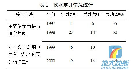 前幾年某單位在水文地質(zhì)領(lǐng)域剛起步,經(jīng)驗不足,找水主要依靠物探工作,片面追求效率,急于求成,效果很不理想。后來意識到了基巖裂隙水地區(qū)水文地質(zhì)調(diào)查工作的重要性,及時調(diào)整了思路,加強了這方面的工作力度,取得了比較好的結(jié)果。近幾年來基巖裂隙水地區(qū)定井成功率見表1。