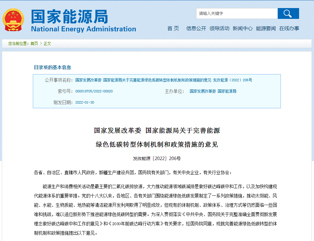 國家發(fā)展改革委、國家能源局近日公布《關(guān)于完善能源綠色低碳轉(zhuǎn)型體制機制和政策措施的意見》(以下簡稱《意見》),明確到2030年,基本建立完整的能源綠色低碳發(fā)展基本制度和政策體系,形成非化石能源既基本滿足能源需求增量又規(guī)?;娲?a href="http://m.kaizhou-edu.cn/t/化石能源.html" >化石能源存量、能源安全保障能力得到全面增強的能源生產(chǎn)消費格局。