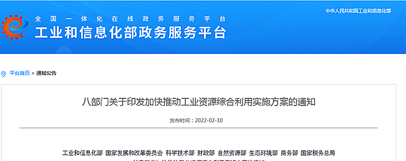 地大熱能地?zé)?多能互補(bǔ)網(wǎng)訊:2月10日,工業(yè)和信息化部、國家發(fā)展和改革委員會、科學(xué)技術(shù)部、財政部、自然資源部、生態(tài)環(huán)境部、商務(wù)部、國家稅務(wù)總局等八部門聯(lián)合印發(fā)了《關(guān)于印發(fā)加快推動工業(yè)資源綜合利用實施方案的通知》(下文簡稱《通知》)。