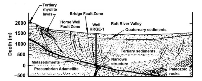 拉夫特河地熱田的熱儲層,處在一個盆地中,這個盆地西部以一個小角度的斷層為界限,東邊則是由黑松山(Black Pine Mountains)和一個二次斷層分界。熱儲的蓋層為第三系的沉積層,基底巖石大約厚度為1600m,在這個深度被一個東北向的線性構造—解理構造(Narrows Structure)所貫穿,人們認為這個結構是基底剪切作用產生的。熱源為前寒武紀二長花崗巖。開始,人們認為熱液是通解理構造涌上來,然后通過其他的褶皺和斷層蔓延整個沉積構造?,F(xiàn)在的人們則認為有兩個熱源補給區(qū),一個來自西北方向沿著馬井斷層分布的補給區(qū),另外一個則是來自東南方向的,可能是與變窄構造有關聯(lián)。