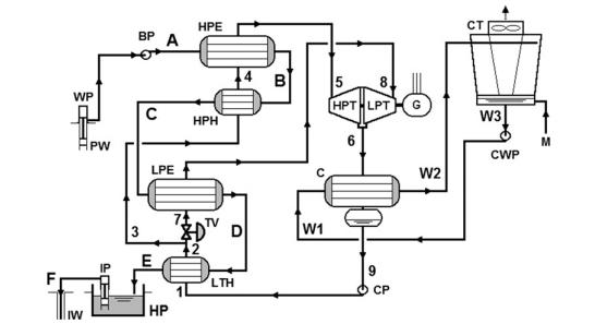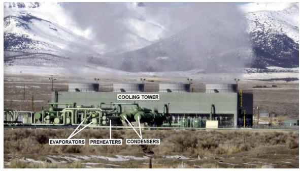 最新的USGeo拉夫特河發(fā)電站坐落在起初的電站南南東方向約600m的地方。這個最新的發(fā)電機組的能量對流系統(tǒng)是一個部分回熱,二級,雙壓力雙循環(huán)發(fā)電機組。有兩個單獨的單元,每一個單元都有兩個軸向流動的渦輪來驅動同一個中心發(fā)電機。一個四室的水冷卻塔為殼管冷凝器(shell-and-tube condensers)提供冷卻提供冷卻水。補充水是從水井中獲取的,而且需要及時處理來維持冷卻塔中的水的質量。138℃的鹵水以大約3.15×106kg/s的速度泵向蒸發(fā)器和預熱器,循環(huán)工質異戊烷(i-C5H12)就是在蒸發(fā)器和預熱器中吸收溫度的。換熱器只在高壓循環(huán)中才使用。