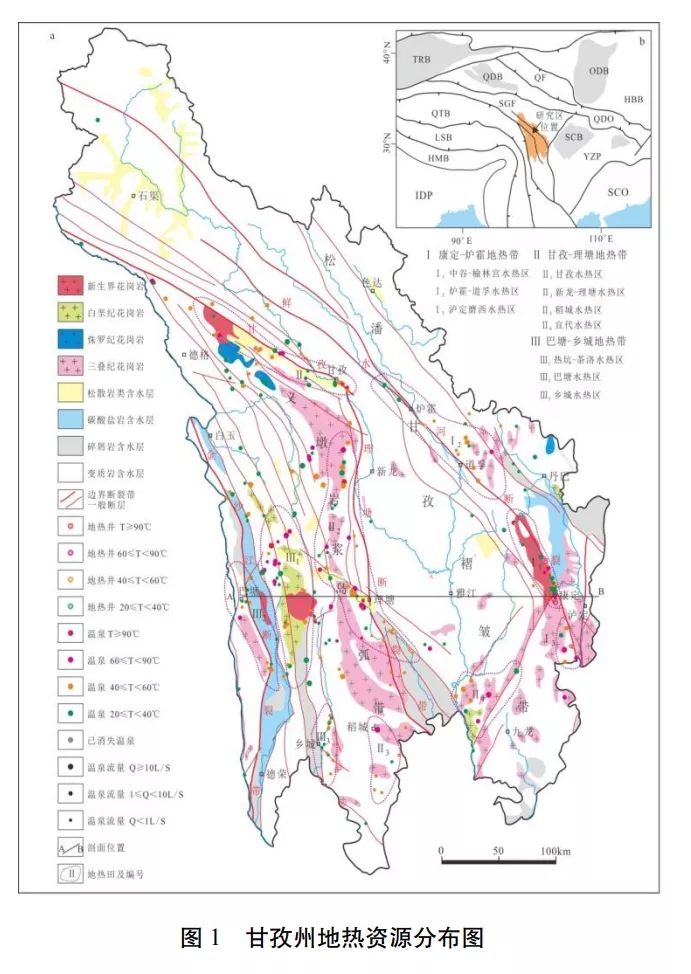 據(jù)最新調(diào)查成果,甘孜州的水熱活動強烈,全州共有溫泉點264 個,地?zé)峋?/a>17 口, 除色達(dá)縣外,其余17 縣均有水熱活動。 全州溫泉分布主要受 3 條深大斷裂帶和數(shù)條主要大斷裂(德格-鄉(xiāng)城大斷裂帶、玉科大斷裂帶、 陳支大斷裂帶等)控制,形成了3個主要地?zé)釒?/a>和9個水熱活動集中分布區(qū)的基本分布格局。水熱活動強烈區(qū)一般位于主干斷裂帶及其轉(zhuǎn) 折的部位,以康定縣、甘孜縣、理塘縣、巴塘縣 為典型代表。