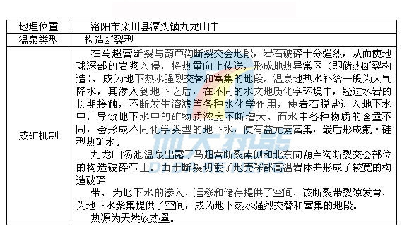河南省欒川九龍山溫泉風(fēng)景九龍山溫泉時流量56噸,常年恒溫69.5℃,內(nèi)含鉀、鈉、鈣、鎂、鋰、鍶、碳酸根等27種有益元素,另外含有鈾、氡兩種弱放射性元素,為氟硅復(fù)合型醫(yī)療礦泉水,對風(fēng)濕、類風(fēng)濕、肩周炎、關(guān)節(jié)炎、肌肉勞損等疾病有很好療效,對皮膚病、婦科病有特效。因該泉水質(zhì)優(yōu)、流量大、溫度高被稱為中原第一泉,因其醫(yī)療效果顯著,被民間譽為九龍神泉。
