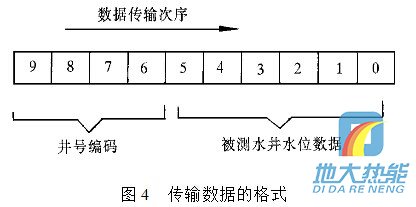 現(xiàn)在通過單片機輸出控制一組由三極管組成的電子開關(guān),由電子開關(guān)代替按鍵功能完成數(shù)據(jù)輸入.例如:要傳輸十進制數(shù)據(jù)0,1,2,3,4,5,6,7,8,9,單片機依次輸出接通雙音頻編碼器輸入數(shù)字按鍵0,1,2,3,4,5,6,7,8,9對圖4 傳輸數(shù)據(jù)的格式應的電子開關(guān)的控制信號,則該組數(shù)據(jù)經(jīng)雙音多頻編碼器轉(zhuǎn)換為雙音頻信號. 雙音多頻編碼器在單片機控制下,定時“撥通”水位監(jiān)測中心電話號碼,在水位監(jiān)測中心計算機應答并“摘機”的情況下,通過這條已接通的電話線路,將所測的水位數(shù)據(jù),經(jīng) 過雙音多頻編碼器編碼后傳送到監(jiān)控中心. 要傳輸?shù)臄?shù)據(jù)格式為:數(shù)據(jù)長度為10位十進制數(shù),其中高四位為井號編碼,低六位為所測量的水井水位數(shù)據(jù),水位數(shù)據(jù)分整數(shù)和小數(shù)兩部分.數(shù)據(jù)傳輸?shù)姆较蚴菑母呶坏降孜?數(shù)據(jù)格式如圖4所示.