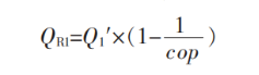 式中:QR1 為巖土體提供熱量;Q1′為建筑空調(diào)總熱負(fù)荷, 2963 kW;cop 為熱泵機(jī)組制熱性能系數(shù),5.0。由式(1)得QR1=2370.4 kW, 即巖土體吸熱量2370.4 kW,滿足建筑供暖需求。巖土體制冷量計(jì)算見式(2)。