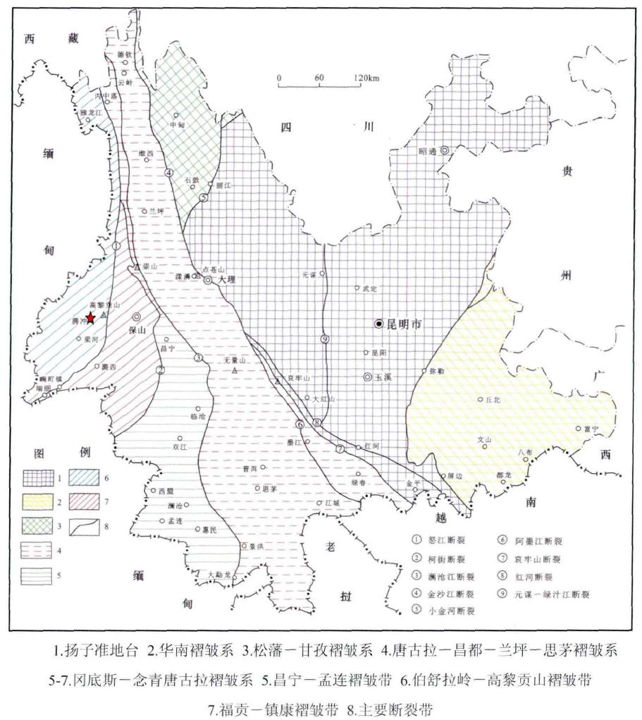 騰沖縣位于高黎貢山西側(cè),總體地勢北高南低,山脈走向為北東一西向及南北向,與區(qū)域構(gòu)造線基本一致。高黎貢山與怒江并列向南蜿誕,高黎貢山峰脊一線海拔多在3000m以上;而怒江河谷海拔僅500—900m,區(qū)內(nèi)最高峰為高黎貢山中段的大腦子,海拔3780.9m;最低點為盈江縣拉沙河與穆雷江交匯處,海拔僅210m;最大高差達3570.9m,一般高差在400—2000m之間,屬中高山中一深切割地區(qū)。縣城西側(cè)為高中山地貌景觀,谷深坡陸;東側(cè)為中山山地稍為平緩,但切割密度較大;中部為斷陷谷地,河流階地發(fā)育,地勢平坦開闊。騰沖地區(qū)構(gòu)造運動活躍、斷裂構(gòu)造發(fā)育、巖漿活動頻繁、火成巖分布廣泛、新生代火山活動、現(xiàn)代水熱活動異常強烈,溫沸泉眾多。