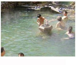 云南巴臘掌溫泉風(fēng)景在諸泉中,最有特點(diǎn)和傳奇色彩的要數(shù)“仙人澡塘”。在一塊高出河面約25米的巖石上,共有3潭泉水:大的面積約為4平方米, 小的面積分別為0.4和0.5平方米,相隔僅20厘米,卻一冷一熱, 熱的溫度高達(dá)95攝氏度,冷的只有20攝氏度。